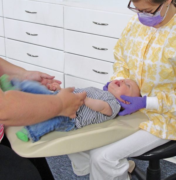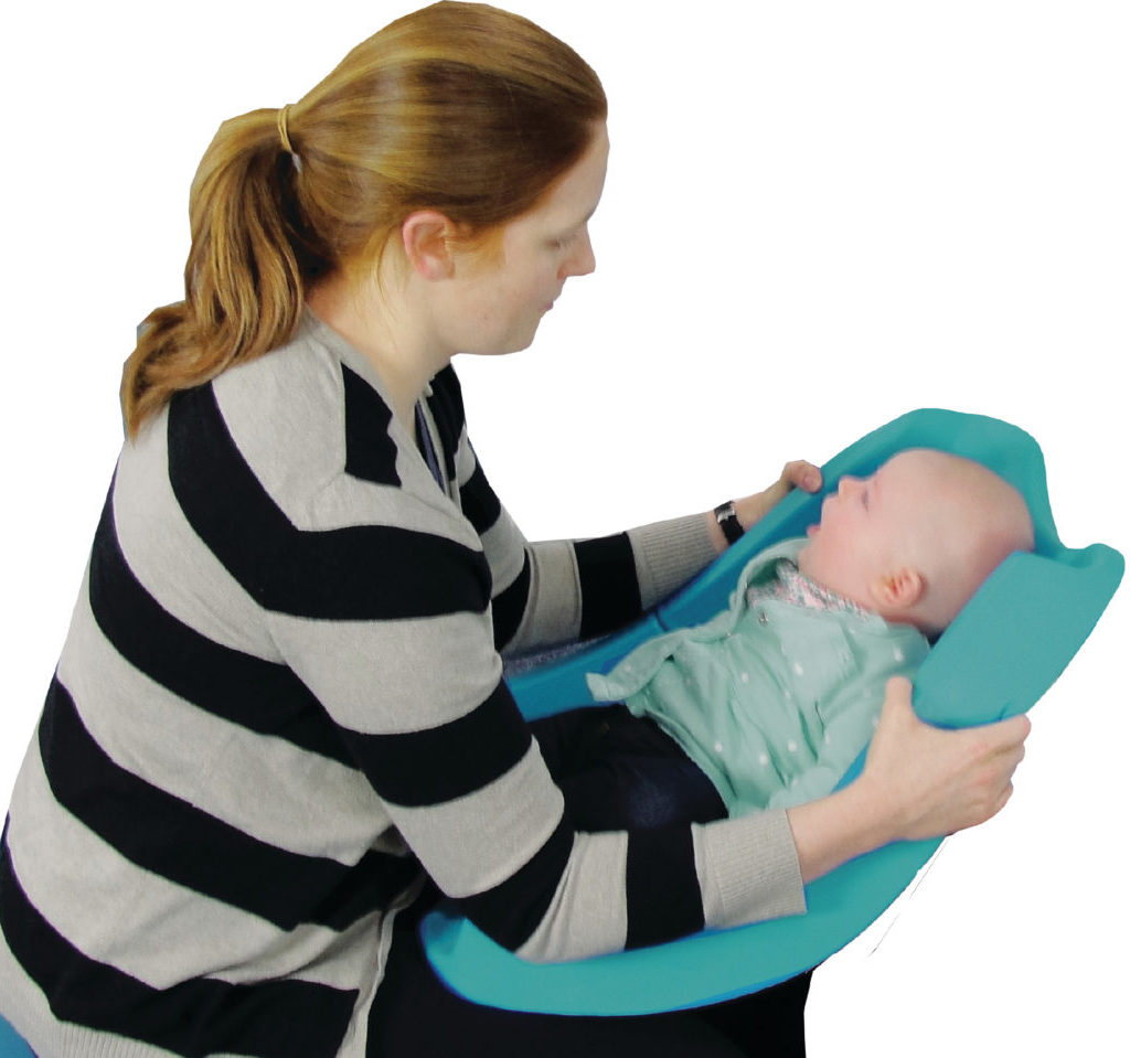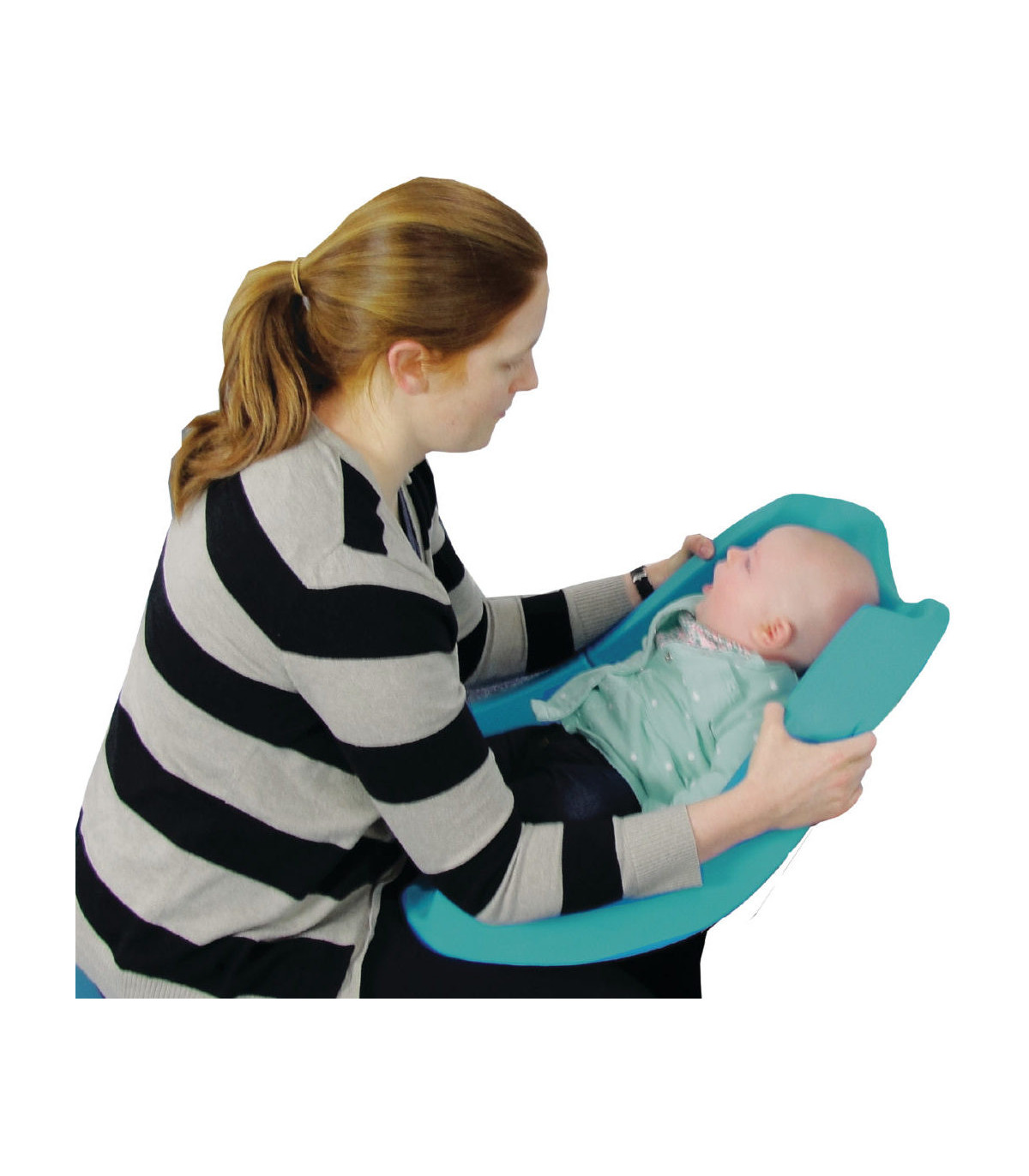 Cushion can be placed behind baby whilst being held by parent and then tilted into the lap of the dental clinician increasing the baby’s sense of protection.